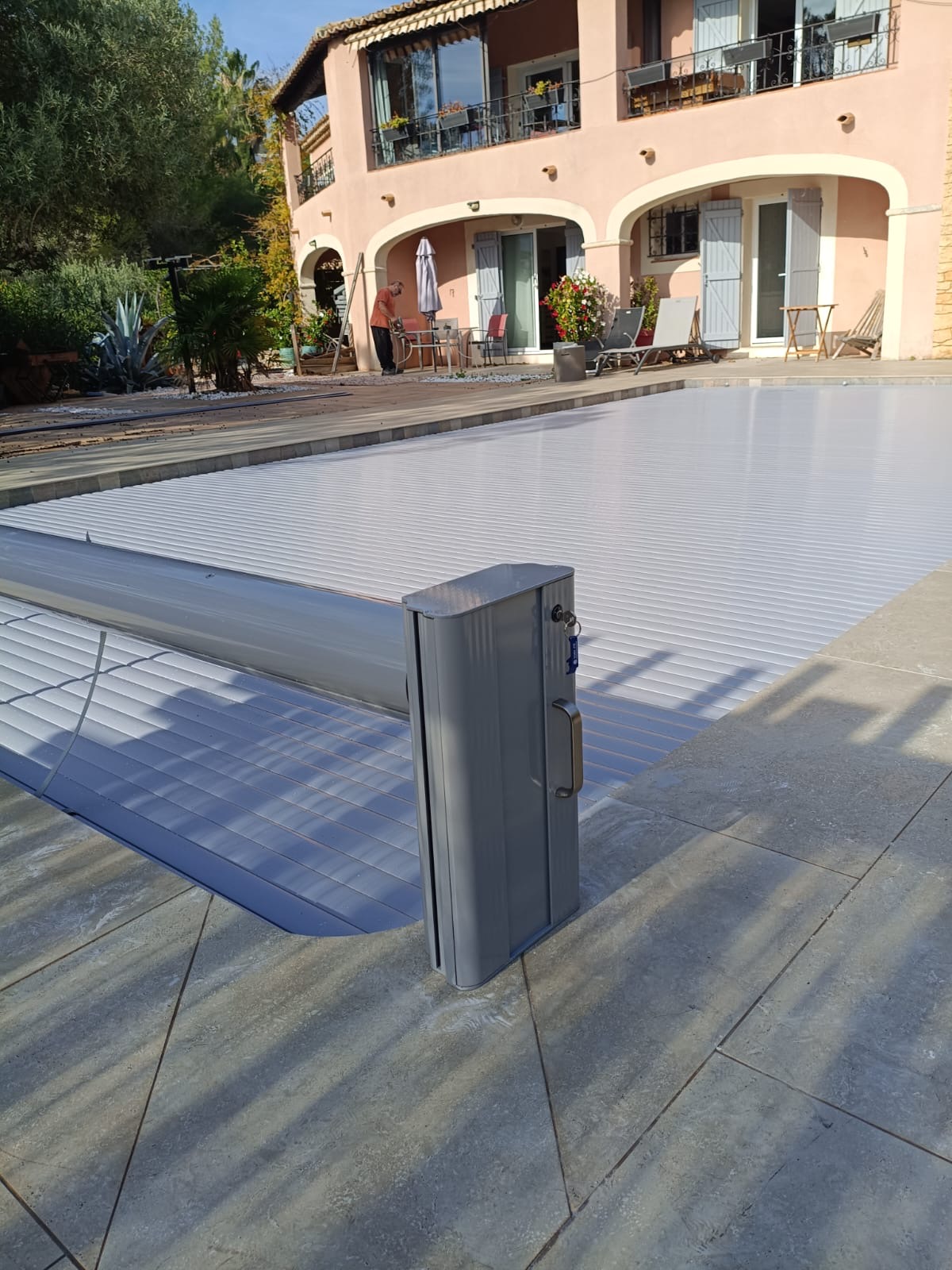 Volet de sécurité de piscine conforme à la norme NF P90-308 fabriqué en France et garanti 3 ans. Modèle exclusif 100% en aluminium laqué (axe et flasques) disponible en Blanc, Gris, Gris foncé, Ivoire et Taupe. Lames en PVC ou Polycarbonate haute durabilité. Installation simple et rapide.